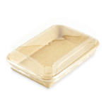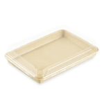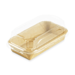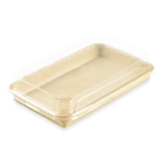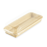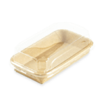 Une gamme de barquettes originales et écologiques pour la vente de Sushis. La partie contenant est en carton Kraft, avec un film PE très fin permettant de maintenir la qualité et l’humidité idéale de vos Sushis. Cet emballage est recyclable dans la filière carton, avec 90 % de matière plastique en moins par rapport aux barquettes traditionnelles. Le rebord arrondi permet un parfait clipsage du couvercle transparent en PET.